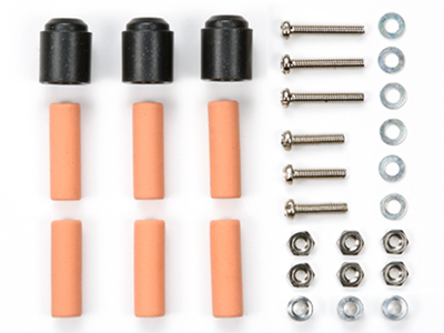リヤバンパーにパイプ形状のソケットを下向きに取り付け、そこにゴムをセットするシンプルな構成。レーンチェンジやスロープを上り始める時、ブレーキゴムが路面と接触してマシンを減速させコースアウトを防ぎます。付属のアルミカラーをセットすることで小径、大径タイヤに対応。各種FRPプレートにも取り付けできます。