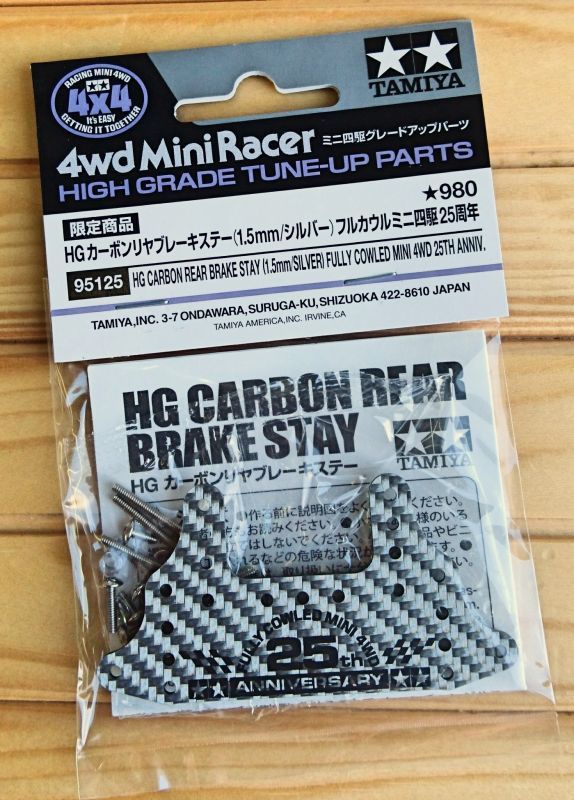 【 マシンの性能アップやセッティングに役立つパーツです 】 軽く強度の高いシルバーカーボン製のリヤブレーキステーです。アップダウンのあるコースでは欠かせないブレーキスポンジを貼る面積が大きく、ローラーと干渉しにくい形状。レーシーなシルバーカーボンはレースでも注目度抜群。フルカウルミニ四駆25周年を記念した文字をブラックで印刷。マスダンパーなどが取り付けられる穴が多く開いているのも特徴です。取り付け用の2mmビスやアルミカラーなどもセットしました。MA、MS、FM-A、AR、VS、スーパーII、スーパーX、スーパーXX、スーパーTZ-Xシャーシ各車に使えます。 ※印刷が取れるため、クリーナー等は使わないでください。※表面を銀色のFRPで装飾したカーボンプレートです。